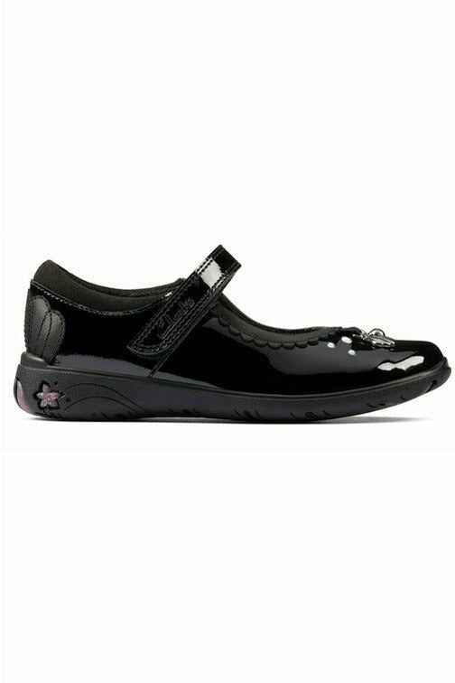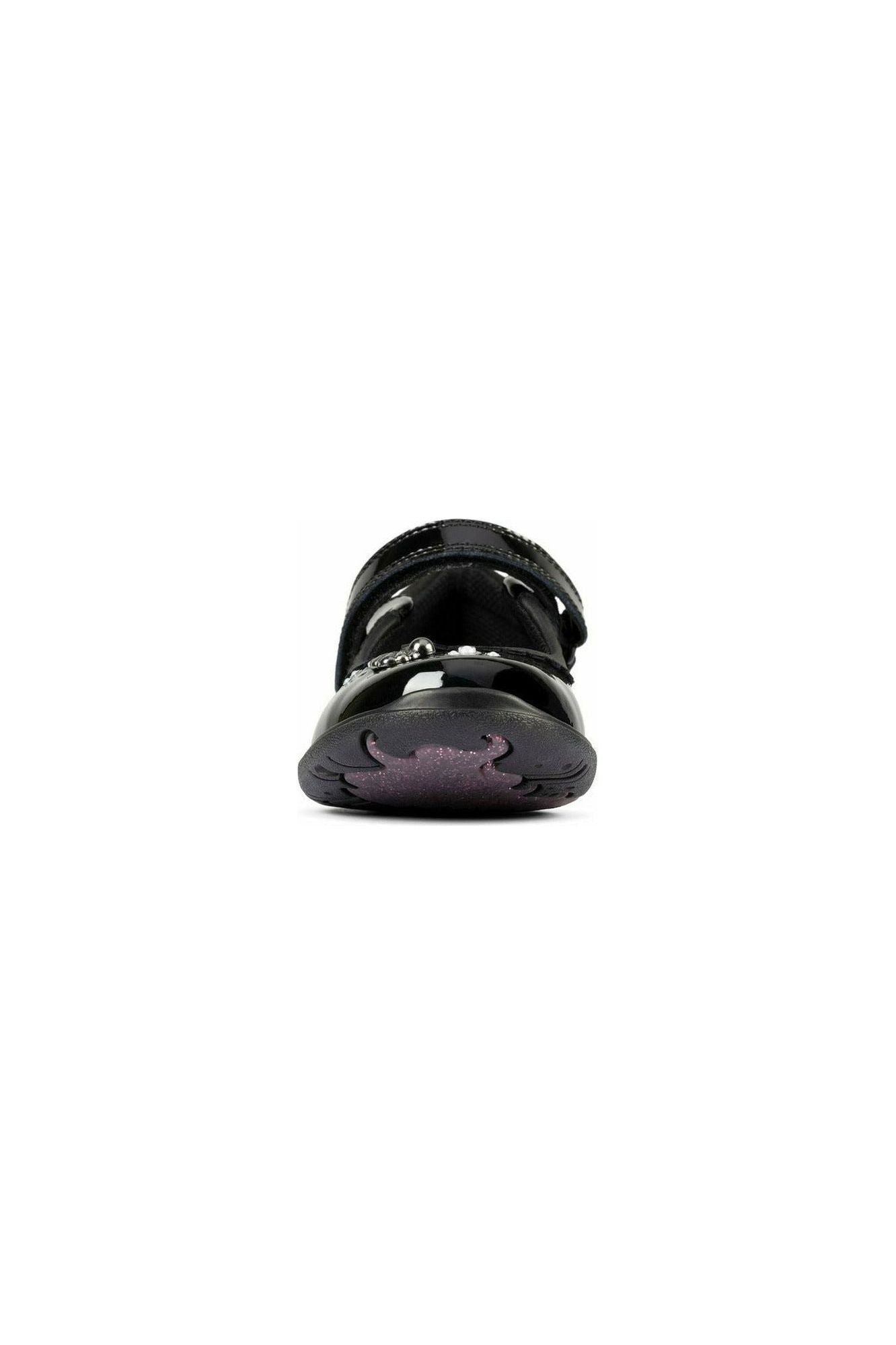 Introducing a brand new favourite-to-be to our Clarks school collection - Sea Shimmer, featuring gorgeous mermaid character detailing. A classic Mary Jane upper in durable black patent leather is embellished with a sprinkling of subtle pearls and shell motif at the heel. Clarks signature comfort elements are all in place, such as a padded collar for support, an easy-adjust strap, fresh feeling agion linings which come with 50% recycled content. The grippy rubber heel boasts an integral mermaid design that creates magical footprints wherever you go. Available in whole and half sizes and different widths..