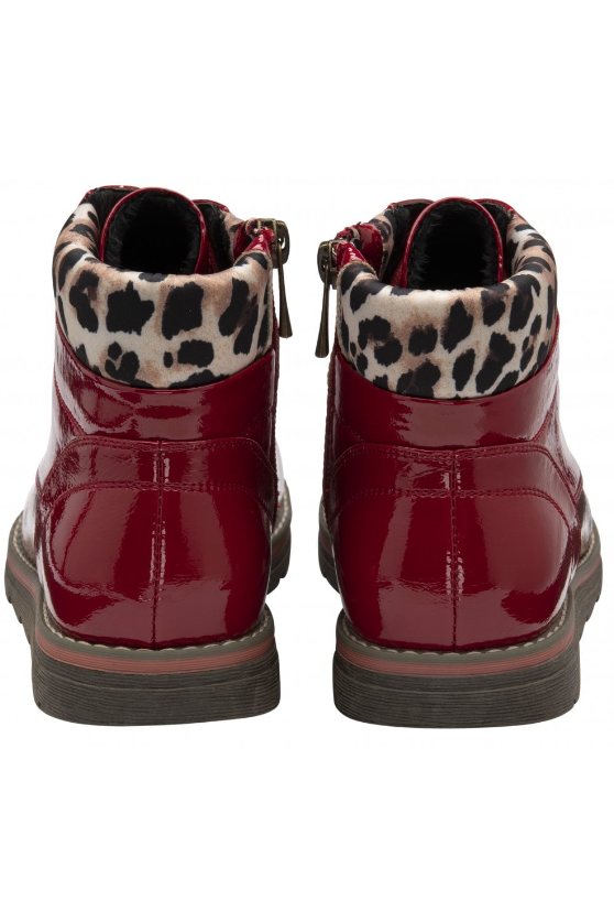 Two of this season’s key trends have been amalgamated on the Lotus Naomi ankle boot; hiking boot styling and leopard print detailing on the ankle collar are evident on this almost flat Lotus boot. The glossy patent upper on this women’s lace-up black ankle boot is also met with gold metal eyelets and a serrated sole unit to give it a modern day vibe.